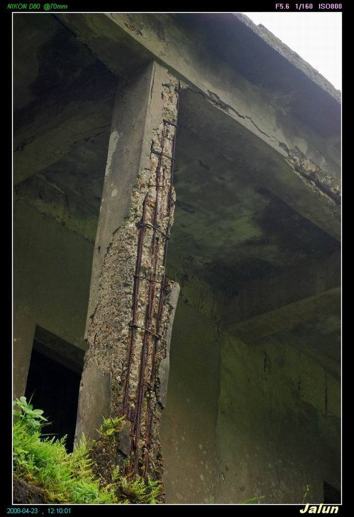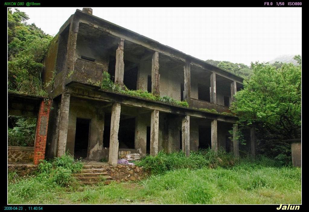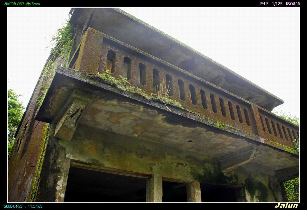 第一幢完整的建築物是個二層樓的建築,頂上覆有瓦片,嗯,至少,原本的規劃上,上面是要覆有瓦片的。早已是人去樓空,是個混泥土建築,與旁邊的斷垣殘壁有明顯不同,也難怪保存的完整許多。一樓中似乎還偶爾有些人在此過夜,遺留有一些露宿的遺跡,而屋後通往二樓的階梯則是被雜草土石所掩蓋,到不了二樓,倒可以直上屋頂!