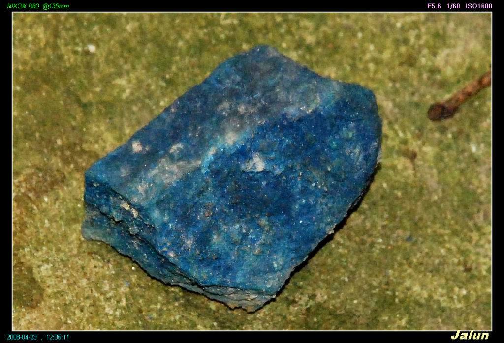 第二幢建築物中有土石流流過的痕跡,早已被掩蓋在碎石堆裡,謝憨在這亂石中撿到一塊顏色相當驚人的石頭,完美的深藍色!應該是銅離子的顏色吧!附著在一塊安山岩上面,顏色只有薄薄一層。這會是什麼
